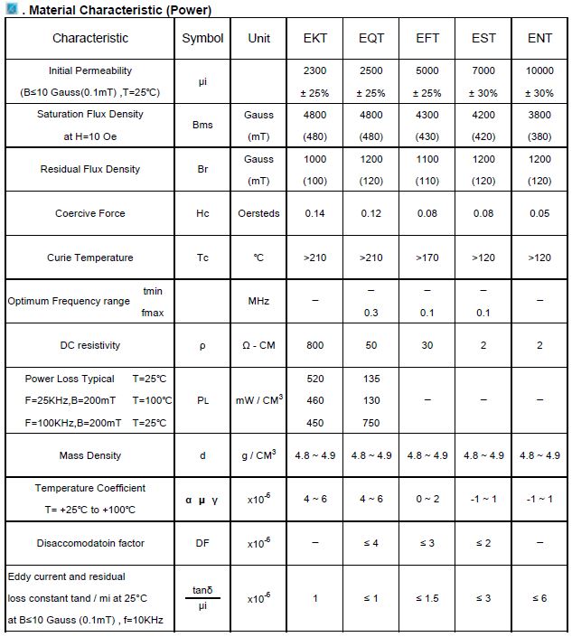 MnZn錳鋅鐵氧體可以通過以下幾種方式,改變其成分和工藝來製造出不同等級與種類的產品。初磁導磁率(在25℃時)的範圍可以從幾百到幾萬。磁飽和濾(在25℃下)的範圍為3500至5000高斯。居里溫度範圍從100℃到300℃,針對以上不同的材質特性,開發不同種應用(例如電源、寬頻EMI、RFI應用)。另外,聯磁Erocore耕耘數十年的磁性元件材料經驗,可以提供不同尺寸與材質的磁芯,滿足客戶的客制化需求,並提供合理的價格與快速的交期。